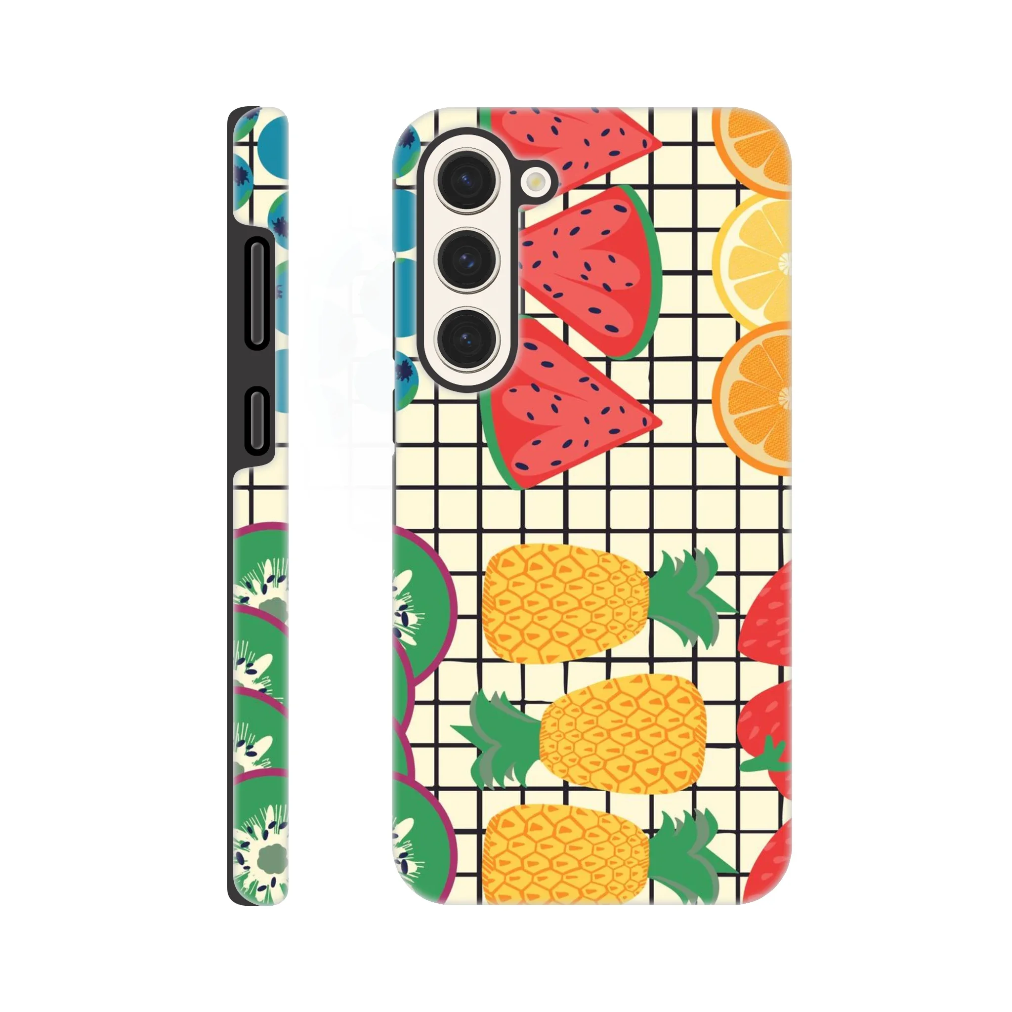 A bold fruit grid with pineapples, kiwis, strawberries, oranges and blueberries. Designed for gifting, stationery, and statement homewares.